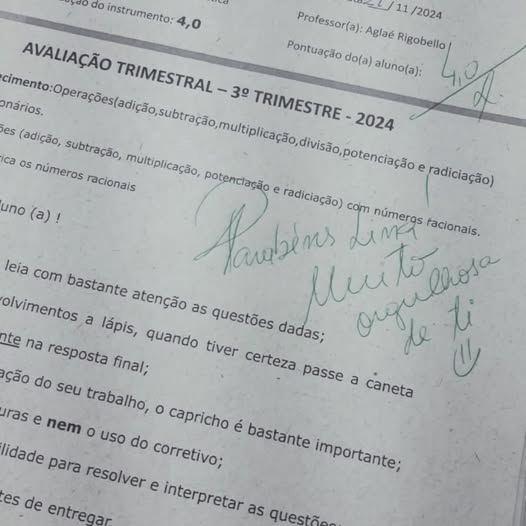 É isso, pequena. Presta atenção em tudo. Mesmo no que aparentemente não te interessa (como os fenícios, que eu também não curtia muito, por isso te entendo). A gente aprende sempre. Nunca te esquece disso. Parabéns pela nova etapa escolar cumprida. Que venham as férias. Assim como a professora de matemática escreveu na prova gabaritada que ilustra este post, estou muito orgulhosa de ti!